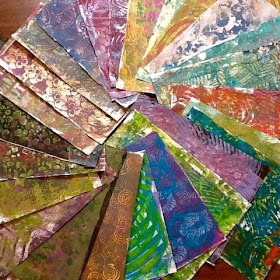 Mono printen, stofjes parfait verven, en nog andere materialen voorbewerkt zoals Tyvek en lutrador